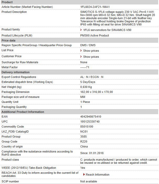 SIMOTICS S-1FL6 voltage supply 230 V 3AC Pn=0.1 kW; Nn=3000 rpm M0=0.32 Nm; MN=0.32 Nm. Shaft height 20 mm absolute encoder Single-turn 21-bit with feather key Tolerance N without holding brake Deg……