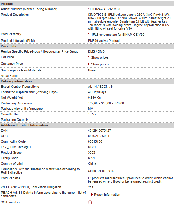 SIMOTICS S-1FL6 voltage supply 230 V 3AC Pn=0.1 kW; Nn=3000 rpm M0=0.32 Nm; MN=0.32 Nm. Shaft height 20 mm absolute encoder Single-turn 21-bit with feather key Tolerance N with holding brake Degree……