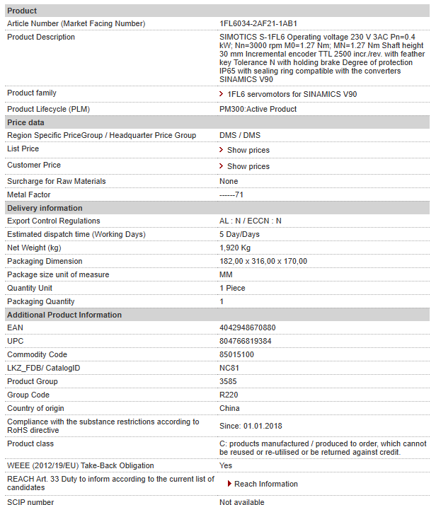 SIMOTICS S-1FL6 Operating voltage 230 V 3AC Pn=0.4 kW; Nn=3000 rpm M0=1.27 Nm; MN=1.27 Nm Shaft height 30 mm Incremental encoder TTL 2500 incr./rev. with feather key Tolerance N with holding brake ……