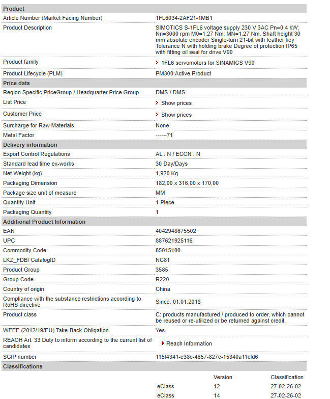 SIMOTICS S-1FL6 voltage supply 230 V 3AC Pn=0.4 kW; Nn=3000 rpm M0=1.27 Nm; MN=1.27 Nm. Shaft height 30 mm absolute encoder Single-turn 21-bit with feather key Tolerance N with holding brake Degree……