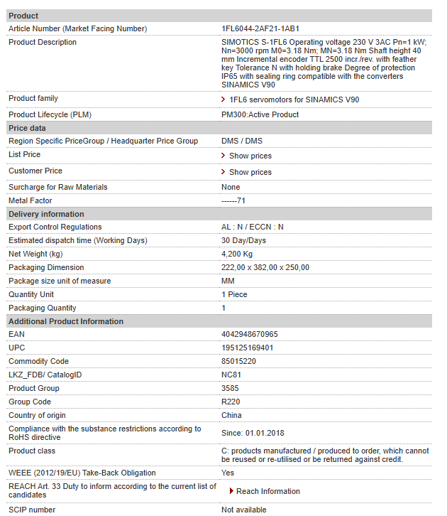 SIMOTICS S-1FL6 Operating voltage 230 V 3AC Pn=1 kW; Nn=3000 rpm M0=3.18 Nm; MN=3.18 Nm Shaft height 40 mm Incremental encoder TTL 2500 incr./rev. with feather key Tolerance N with holding brake De……