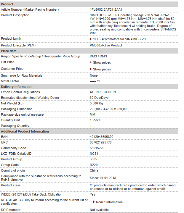 SIMOTICS S-1FL6 Operating voltage 230 V 3AC PN=1.5 kW; NN=3000 rpm M0=4.78 Nm; MN=4.78 Nm shaft he 50 mm with angle plug encoder incremental TTL 2500 incr./rev. with feather key Tolerance N wi hold……