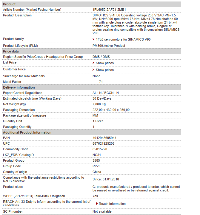 SIMOTICS S-1FL6 Operating voltage 230 V 3AC PN=1.5 kW; NN=3000 rpm M0=4.78 Nm; MN=4.78 Nm shaft he 50 mm with angle plug encoder absolute single-turn 21-bit wit feather key, Tolerance N with holdin……