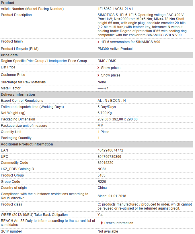 SIMOTICS S-1FL6-1FL6 Operating voltage 3AC 400 V Pn=1 kW; Nn=2000 rpm M0=6 Nm; MN=4.78 Nm Shaft height 65 mm, with angle plug; absolute encoder 20-bits (12-bit multi-turn) with feather key, toleran……