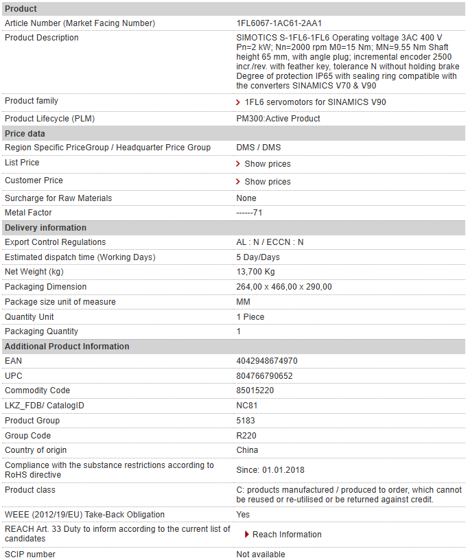 SIMOTICS S-1FL6-1FL6 Operating voltage 3AC 400 V Pn=2 kW; Nn=2000 rpm M0=15 Nm; MN=9.55 Nm Shaft height 65 mm, with angle plug; incremental encoder 2500 incr./rev. with feather key, tolerance N wit……