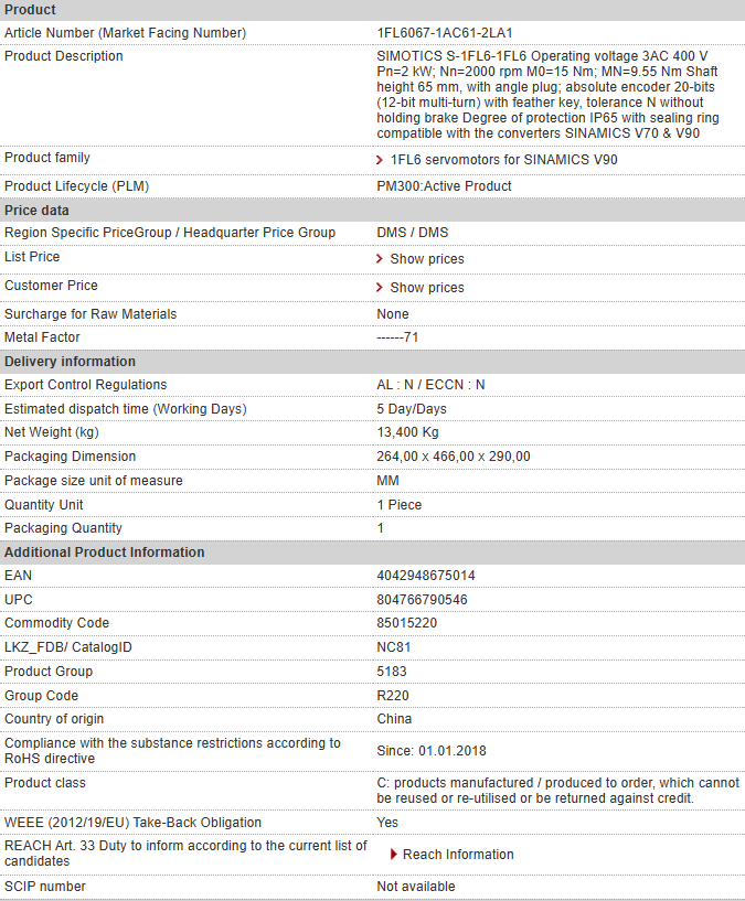 SIMOTICS S-1FL6-1FL6 Operating voltage 3AC 400 V Pn=2 kW; Nn=2000 rpm M0=15 Nm; MN=9.55 Nm Shaft height 65 mm, with angle plug; absolute encoder 20-bits (12-bit multi-turn) with feather key, tolera……