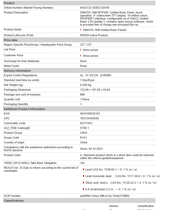 SIMATIC HMI MTP400, Unified Basic Panel, touch operation, 4″ widescreen TFT display, 16 million colors, PROFINET interface, configurable as of WinCC Unified Basic V18 Update 3, contains open-……