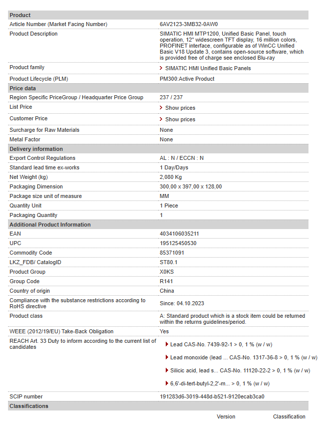 SIMATIC HMI MTP1200, Unified Basic Panel, touch operation, 12″ widescreen TFT display, 16 million colors, PROFINET interface, configurable as of WinCC Unified Basic V18 Update 3, contains ope……