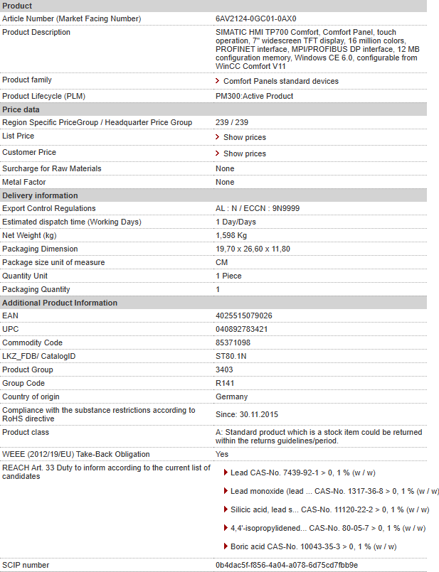 SIMATIC HMI TP700 Comfort, Comfort Panel, touch operation, 7″ widescreen TFT display, 16 million colors, PROFINET interface, MPI/PROFIBUS DP interface, 12 MB configuration memory, Windows CE ……