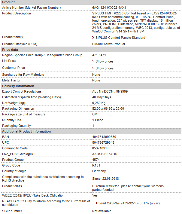 SIPLUS HMI TP2200 Comfort based on 6AV2124-0XC02-0AX1 with conformal coating, 0…+45 °C, Comfort Panel, touch operation, 22″ widescreen TFT display, 16 million colors, PROFINET interface, MPI/……