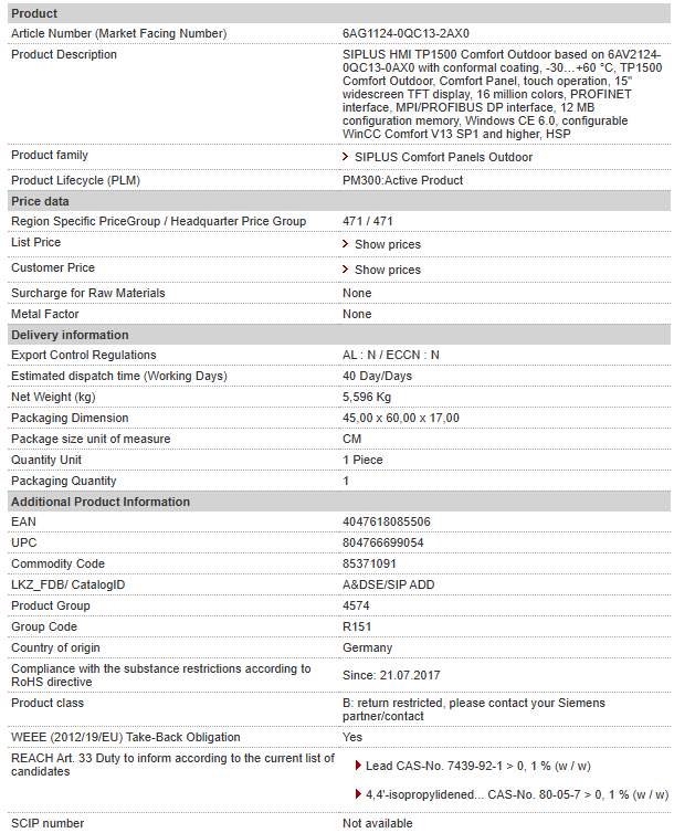 SIPLUS HMI TP1500 Comfort Outdoor based on 6AV2124-0QC13-0AX0 with conformal coating, -30…+60 °C, TP1500 Comfort Outdoor, Comfort Panel, touch operation, 15″ widescreen TFT display, 16 millio……
