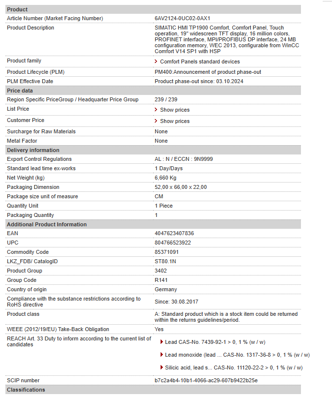 SIMATIC HMI TP1900 Comfort, Comfort Panel, Touch operation, 19″ widescreen TFT display, 16 million colors, PROFINET interface, MPI/PROFIBUS DP interface, 24 MB configuration memory, WEC 2013,……
