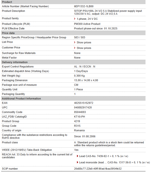 SITOP PSU100L 24 V/2.5 A Stabilized power supply input: 120/230 V AC, output: DC 24 V/2,5 A