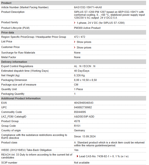 SIPLUS S7-1200 PM 1207 based on 6EP1332-1SH71 with conformal coating, 0…+60 °C, stabilized power supply input: 120/230 V AC output: 24 V DC/2.5 A