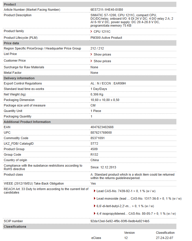 SIMATIC S7-1200, CPU 1211C, compact CPU, DC/DC/relay, onboard I/O: 6 DI 24 V DC; 4 DO relay 2 A; 2 AI 0-10 V DC, power supply: DC 20.4-28.8 V DC, program/data memory 75 KB
