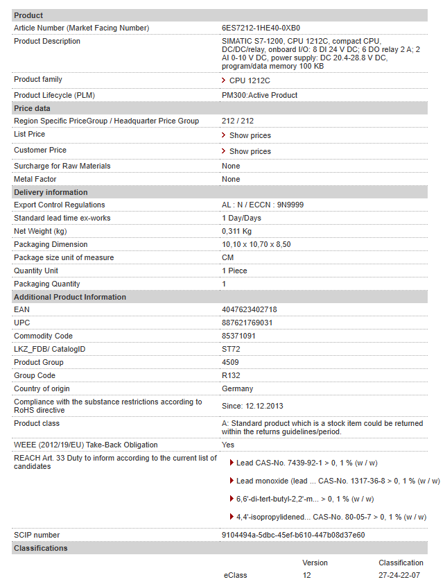 SIMATIC S7-1200, CPU 1212C, compact CPU, DC/DC/relay, onboard I/O: 8 DI 24 V DC; 6 DO relay 2 A; 2 AI 0-10 V DC, power supply: DC 20.4-28.8 V DC, program/data memory 100 KB