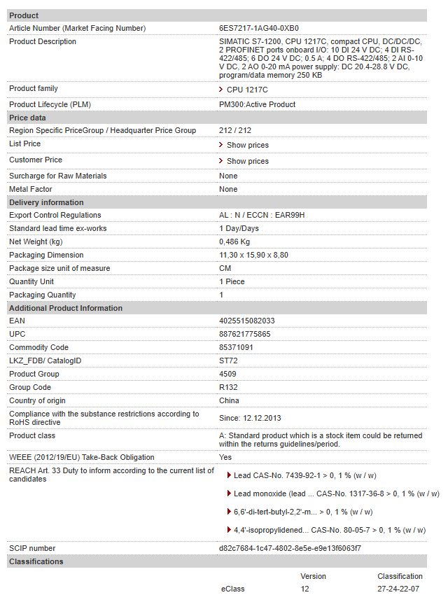 SIMATIC S7-1200, CPU 1217C, compact CPU, DC/DC/DC, 2 PROFINET ports onboard I/O: 10 DI 24 V DC; 4 DI RS-422/485; 6 DO 24 V DC; 0.5 A; 4 DO RS-422/485; 2 AI 0-10 V DC, 2 AO 0-20 mA power supply: DC ……
