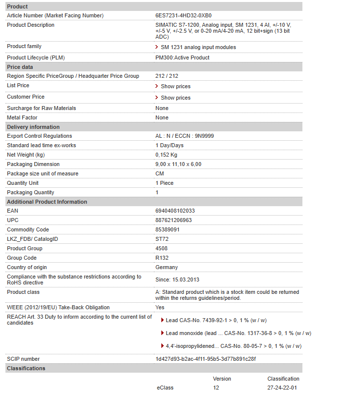 SIMATIC S7-1200, Analog input, SM 1231, 4 AI, +/-10 V, +/-5 V, +/-2.5 V, or 0-20 mA/4-20 mA, 12 bit+sign (13 bit ADC)