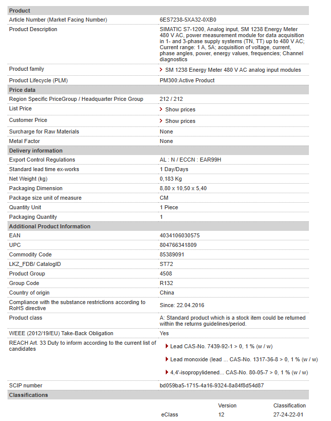 SIMATIC S7-1200, Analog input, SM 1238 Energy Meter 480 V AC, power measurement module for data acquisition in 1- and 3-phase supply systems (TN, TT) up to 480 V AC; Current range: 1 A, 5A; acquisi……