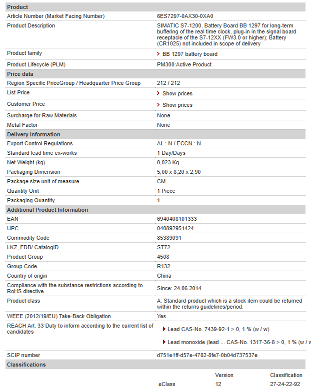 SIMATIC S7-1200, Battery Board BB 1297 for long-term buffering of the real time clock, plug-in in the signal board receptacle of the S7-12XX (FW3.0 or higher); Battery (CR1025) not included in scop……