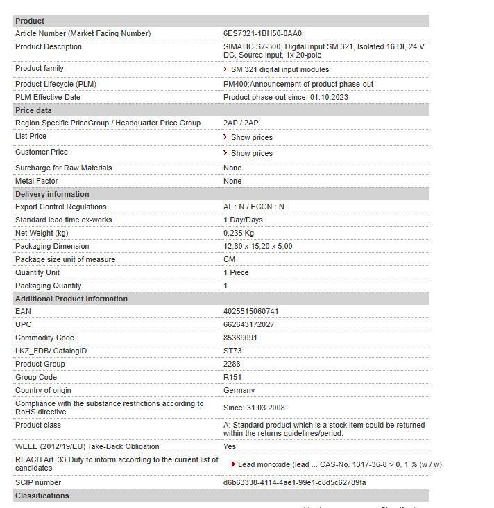 SIMATIC S7-300, Digital input SM 321, Isolated 16 DI, 24 V DC, Source input, 1x 20-pole