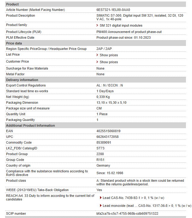 SIMATIC S7-300, Digital input SM 321, isolated, 32 DI, 120 V AC, 1x 40-pole