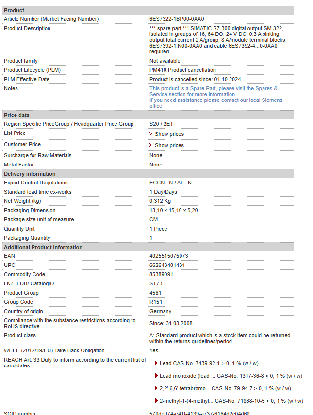 *** spare part *** SIMATIC S7-300 digital output SM 322, isolated in groups of 16, 64 DO, 24 V DC, 0.3 A sinking output total current 2 A/group, 8 A/module terminal blocks 6ES7392-1.N00-0AA0 and ca……