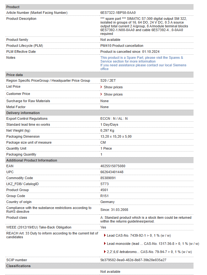 *** spare part *** SIMATIC S7-300 digital output SM 322, isolated in groups of 16, 64 DO, 24 V DC, 0.3 A source output total current 2 A/group, 8 A/module terminal blocks 6ES7392-1.N00-0AA0 and cab……