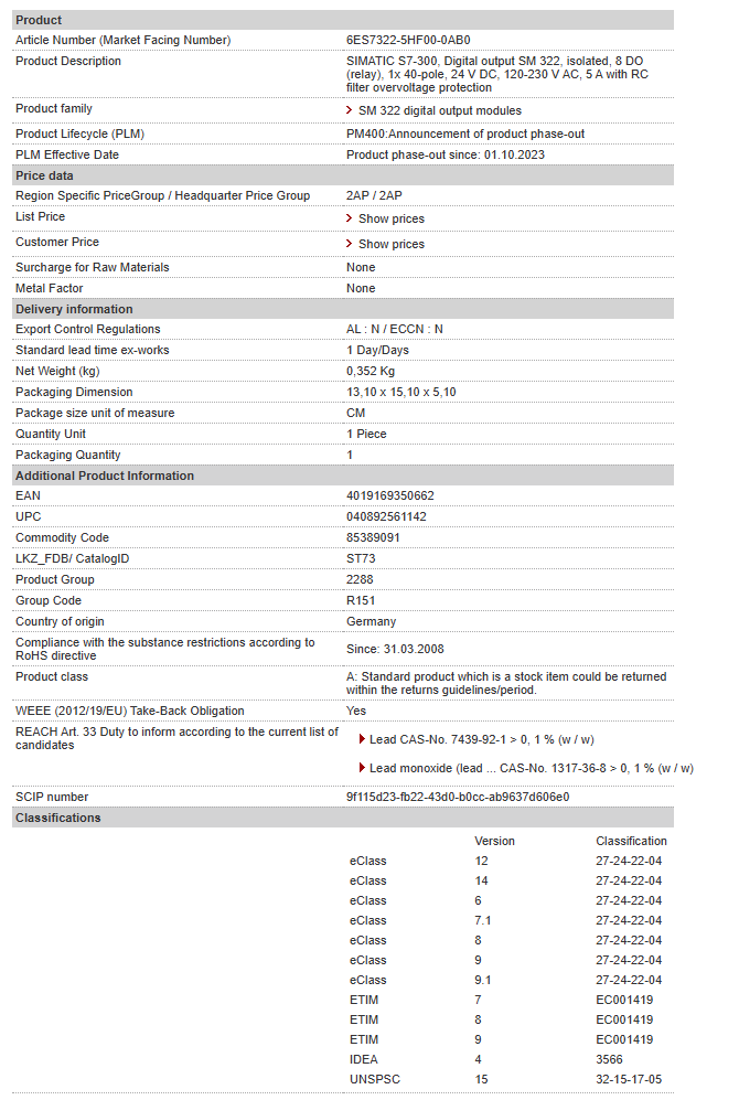 SIMATIC S7-300, Digital output SM 322, isolated, 8 DO (relay), 1x 40-pole, 24 V DC, 120-230 V AC, 5 A with RC filter overvoltage protection