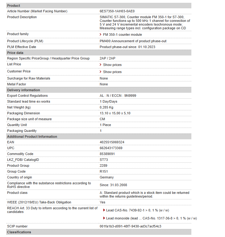 SIMATIC S7-300, Counter module FM 350-1 for S7-300, Counter functions up to 500 kHz 1 channel for connection of 5 V and 24 V incremental encoders Isochronous mode; Measuring range types incl. confi……