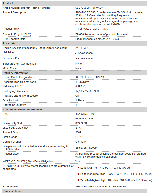 SIMATIC S7-300, Counter module FM 350-2, 8 channels, 20 kHz, 24 V encoder for counting, frequency measurement, speed measurement, period duration measurement, dosing incl. configuration package and……