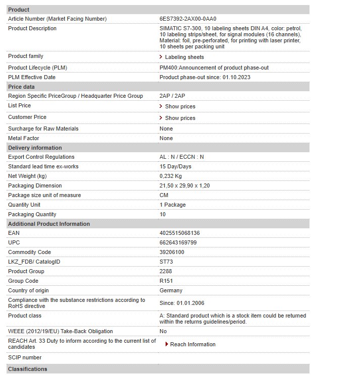 SIMATIC S7-300, 10 labeling sheets DIN A4, color: petrol, 10 labeling strips/sheet, for signal modules (16 channels), Material: foil, pre-perforated, for printing with laser printer, 10 sheets per ……
