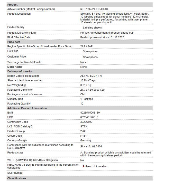 SIMATIC S7-300, 10 labeling sheets DIN A4, color: petrol, 10 labeling strips/sheet, for signal modules (32 channels), Material: foil, pre-perforated, for printing with laser printer, 10 sheets per ……