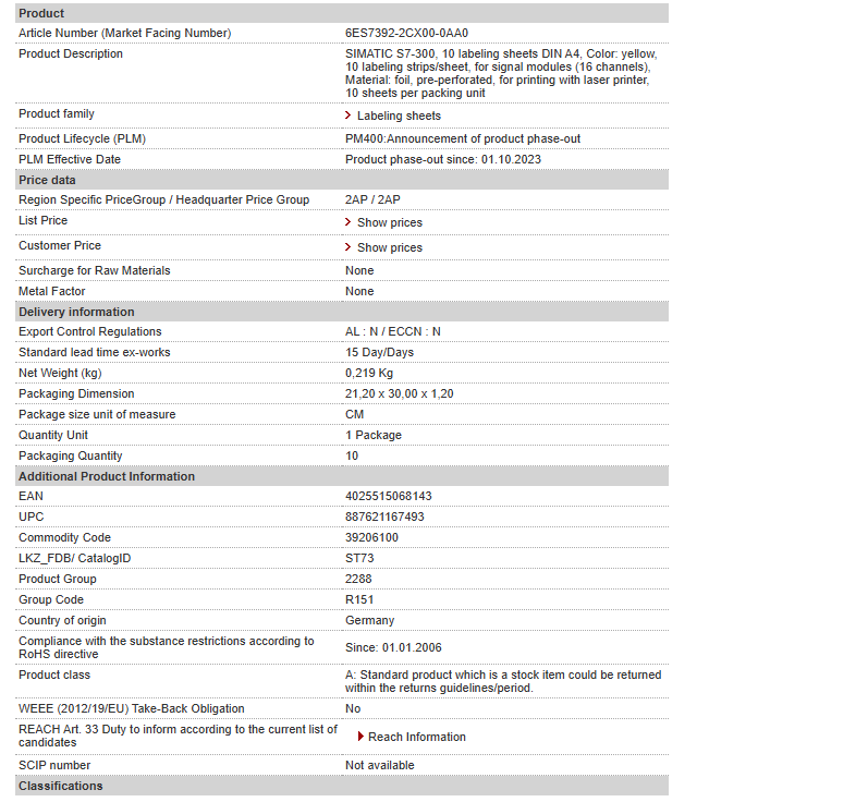 SIMATIC S7-300, 10 labeling sheets DIN A4, Color: yellow, 10 labeling strips/sheet, for signal modules (16 channels), Material: foil, pre-perforated, for printing with laser printer, 10 sheets per ……