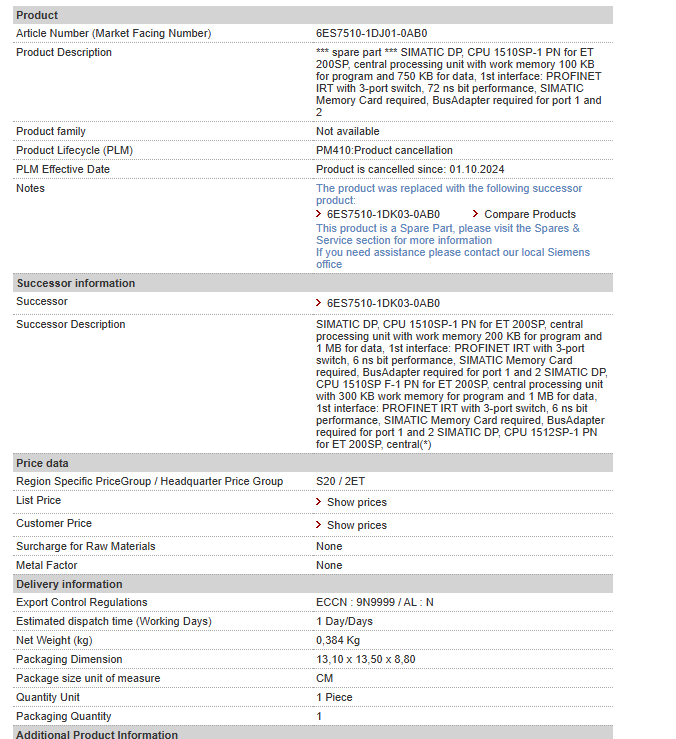 *** spare part *** SIMATIC DP, CPU 1510SP-1 PN for ET 200SP, central processing unit with work memory 100 KB for program and 750 KB for data, 1st interface: PROFINET IRT with 3-port switch, 72 ns b……
