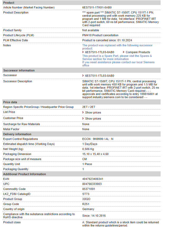 *** spare part *** SIMATIC S7-1500T, CPU 1511T-1 PN, central processing unit with work memory 225 KB for program and 1 MB for data, 1st interface: PROFINET IRT with 2-port switch, 60 ns bit perform……