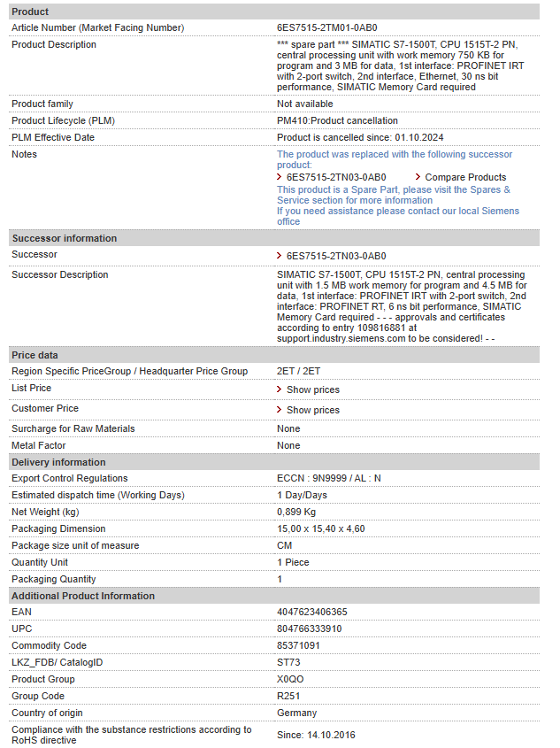 *** spare part *** SIMATIC S7-1500T, CPU 1515T-2 PN, central processing unit with work memory 750 KB for program and 3 MB for data, 1st interface: PROFINET IRT with 2-port switch, 2nd interface, Et……