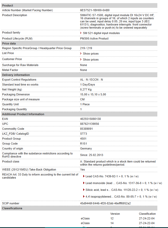 SIMATIC S7-1500, digital input module DI 16×24 V DC HF, 16 channels in groups of 16; of which 2 inputs as counters can be used; input delay 0.05..20 ms; input type 3 (IEC 61131); diagnostics; ……
