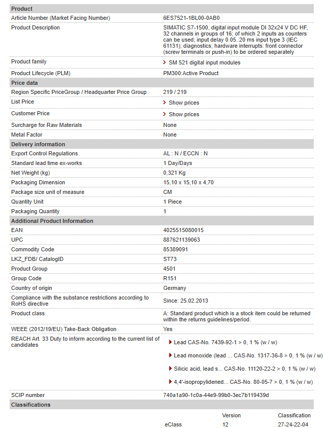 SIMATIC S7-1500, digital input module DI 32×24 V DC HF, 32 channels in groups of 16; of which 2 inputs as counters can be used; input delay 0.05..20 ms input type 3 (IEC 61131); diagnostics; h……