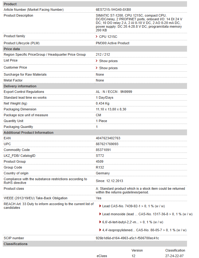 SIMATIC S7-1200, CPU 1215C, compact CPU, DC/DC/relay, 2 PROFINET ports, onboard I/O: 14 DI 24 V DC; 10 DO relay 2 A, 2 AI 0-10 V DC, 2 AO 0-20 mA DC, power supply: DC 20.4-28.8 V DC, program/data m……