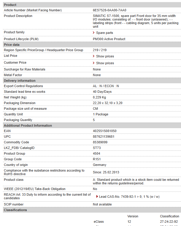 SIMATIC S7-1500, spare part Front door for 35 mm width I/O modules; consisting of: – – front door (unlasered), – – labeling strips (front – – cabling diagram, 5 ……