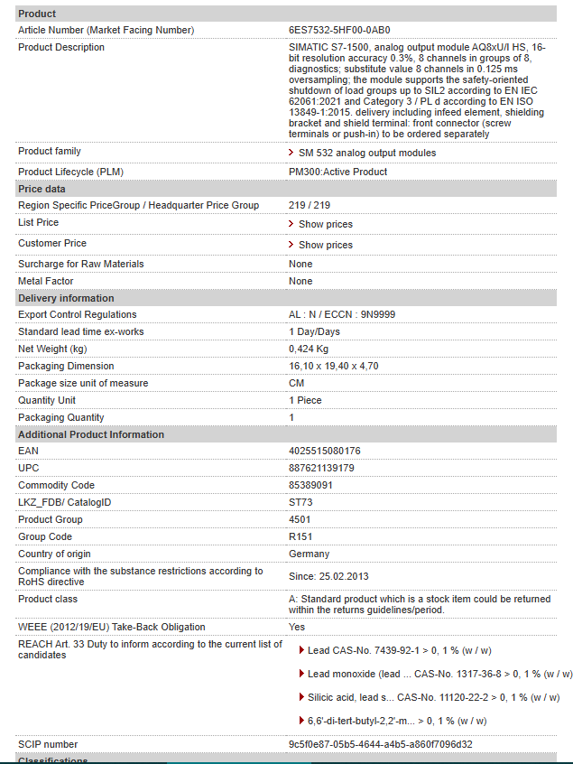 SIMATIC S7-1500, analog output module AQ8xU/I HS, 16-bit resolution accuracy 0.3%, 8 channels in groups of 8, diagnostics; substitute value 8 channels in 0.125 ms oversampling; the module supports ……