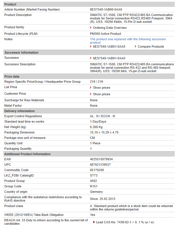 SIMATIC S7-1500, CM PTP RS422/485 BA Communication module for Serial connection RS422,RS485 Freeport, 3964 (R), USS, 19200 Kbit/s, 15-Pin D-sub socket
