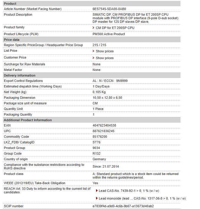 SIMATIC DP, CM PROFIBUS DP for ET 200SP CPU module with PROFIBUS DP interface (9-pole D-sub socket) DP master for 125 DP slaves DP slave,