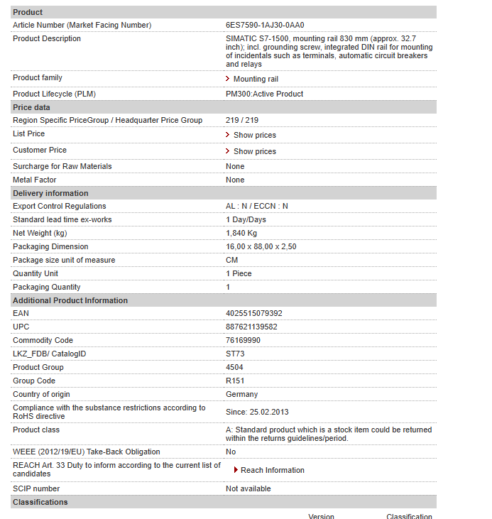 SIMATIC S7-1500, mounting rail 830 mm (approx. 32.7 inch); incl. grounding screw, integrated DIN rail for mounting of incidentals such as terminals, automatic circuit breakers and relays