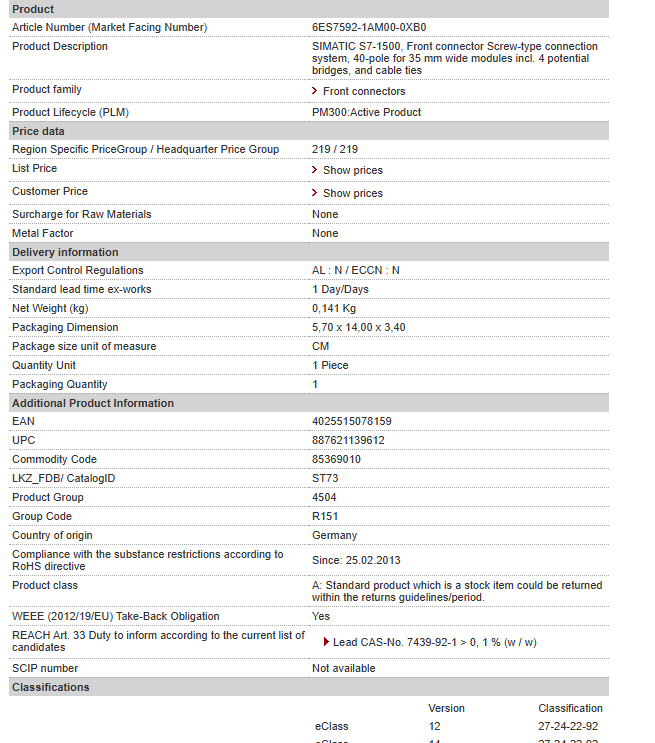 SIMATIC S7-1500, Front connector Screw-type connection system, 40-pole for 35 mm wide modules incl. 4 potential bridges, and cable ties