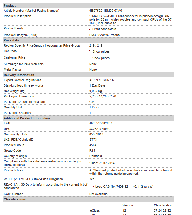 SIMATIC S7-1500, Front connector in push-in design, 40-pole for 25 mm wide modules and compact CPUs of the S7-1500, incl. cable tie