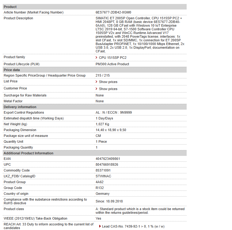 SIMATIC ET 200SP Open Controller, CPU 1515SP PC2 + HMI 2048PT, 8 GB RAM (basic device 6ES7677-2DB40-0AA0), 128 GB CFast with Windows 10 IoT Enterprise LTSC 2019 64-bit, S7-1500 Software Controller ……