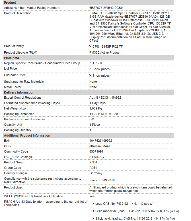 SIMATIC ET 200SP Open Controller, CPU 1515SP PC2 TF, 8 GB RAM (basic device 6ES7677-2DB40-0AA0), 128 GB CFast with Windows 10 IoT Enterprise LTSC 2019 64-bit and S7-1500 Failsafe Software Controlle……