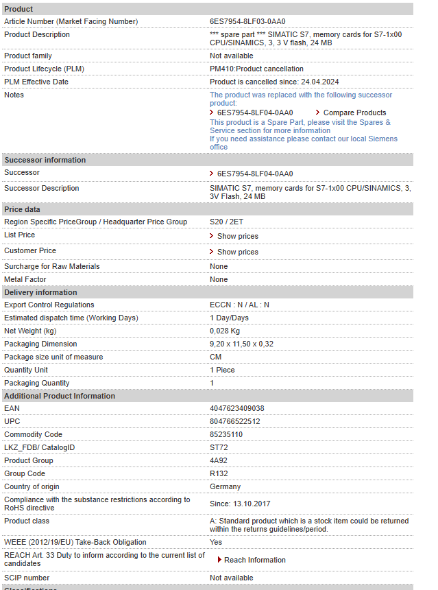 *** spare part *** SIMATIC S7, memory cards for S7-1×00 CPU/SINAMICS, 3, 3 V flash, 24 MB